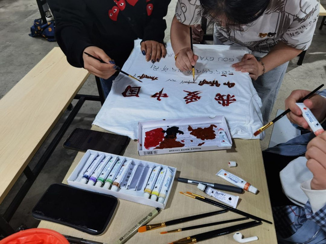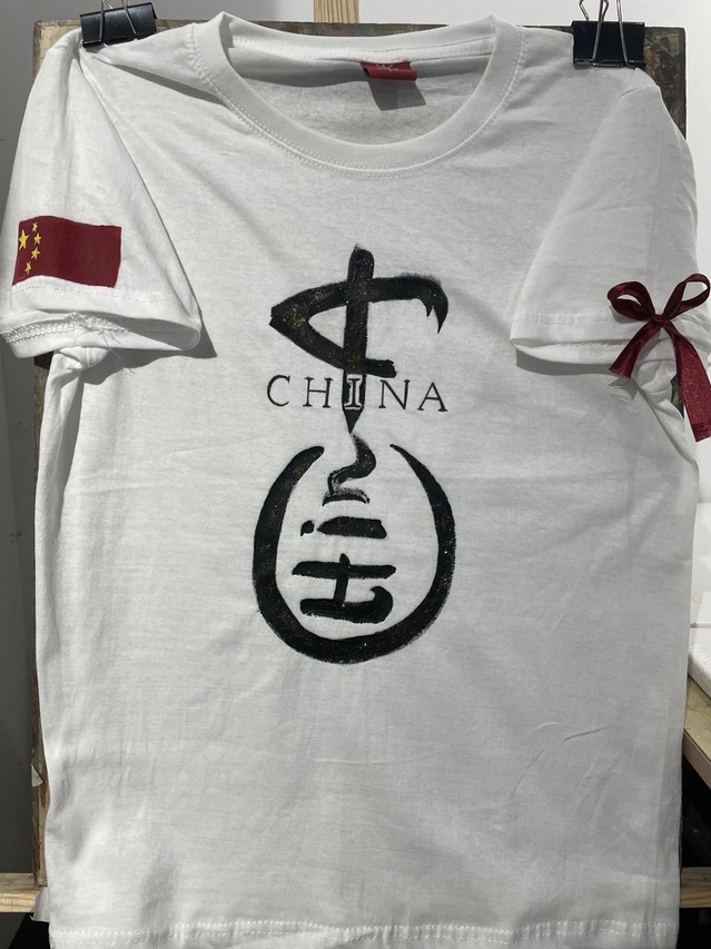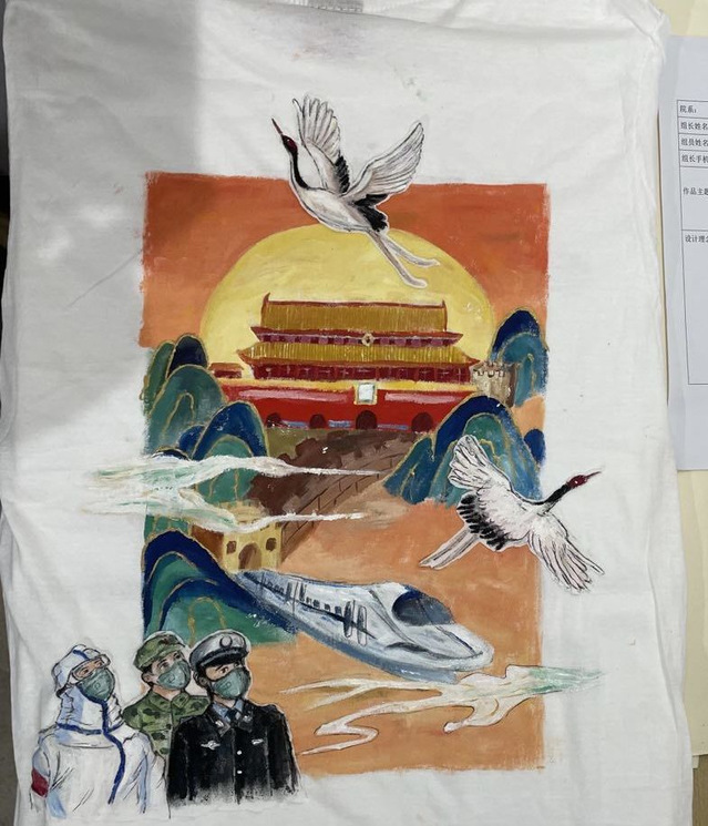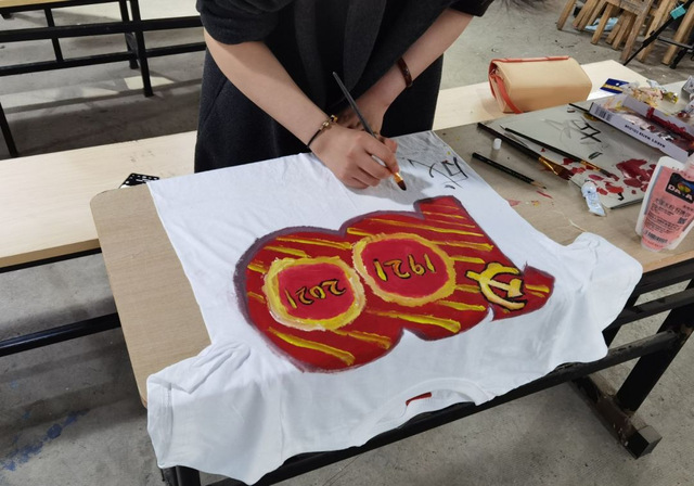 同学们以中国共产党建党100周年以来,各个历史时期的重大历史事件、英雄人物、优秀人才、先进事迹等为创作素材,充分发挥自己的想象力和创造力,打破传统设计观念,利用种种独特的中国元素,将原本平平无奇的T恤装点成独具艺术风格且有寓意的作品。