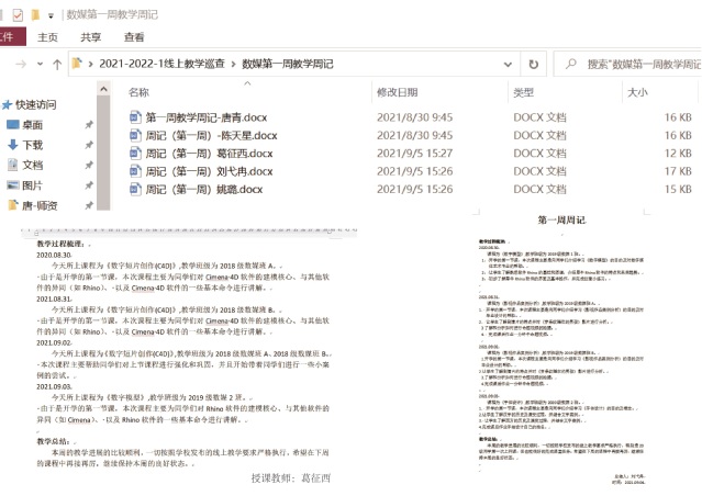 针对线上授课的特殊性,数媒教研室要求本教研室老师们在课程授课结束后,完成周记,对本周的线上教学进行梳理和总结,并形成教学文档,便于接下来的课程顺利及高效授课奠定基础。