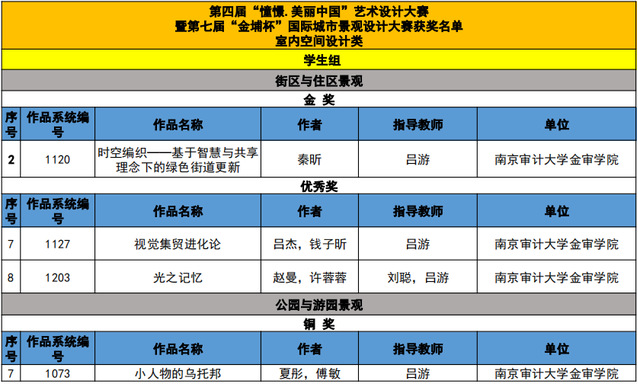 第四届“憧憬.美丽中国”艺术设计大赛暨第七届“金埔杯”国际城市景观设计大赛于2021年4月11日正式启动,同时大赛官网正式上线。我校环境设计专业积极组织学生参与此次大赛。具组委会统计收到国内外75所高校、10所专业设计机构的2734件参赛作品。我专业学生共计获奖28项。2021年12月11日-12日,师生受邀参加大赛颁奖典礼与中国创新设计教育国际论坛、中国农林高校设计艺术联盟年会。