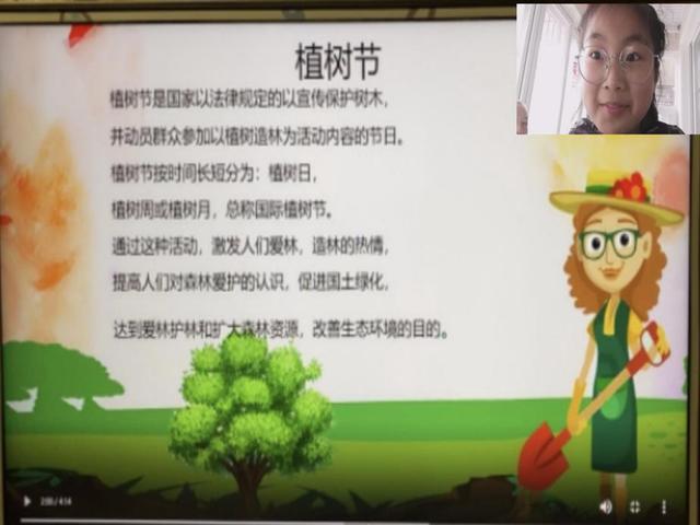 党员小组成员们线上视频连线家中的小朋友们,向他们展示植树节海报设计成果,带领他们学习植树节有关知识,向他们普及植树节的文化、来源、意义等,提高小朋友们保护环境、爱护树木的意识。