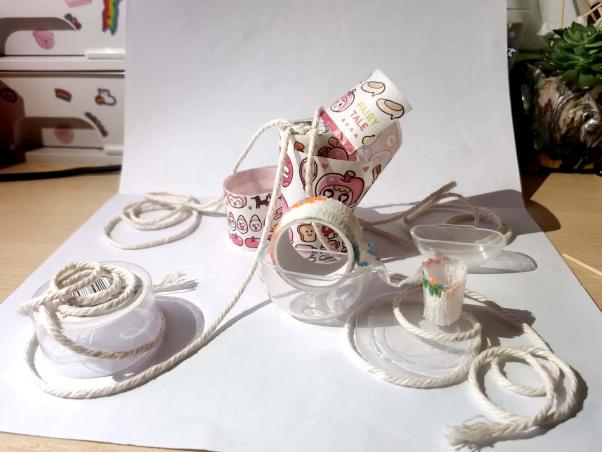 课题训练:选取身边任意物品(食品、生活用品、文具、废品等)进行创意思维空间模型搭建。要求学生突出对物品的认识、能够充分利用选取的物品的造型优势、考虑到点线面结合运用、空间的趣味性。