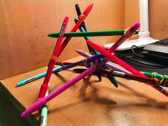 (实物模型材料:笔、皮筋)