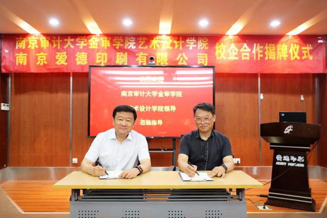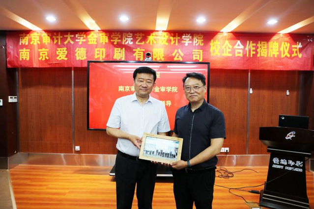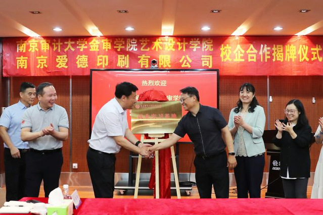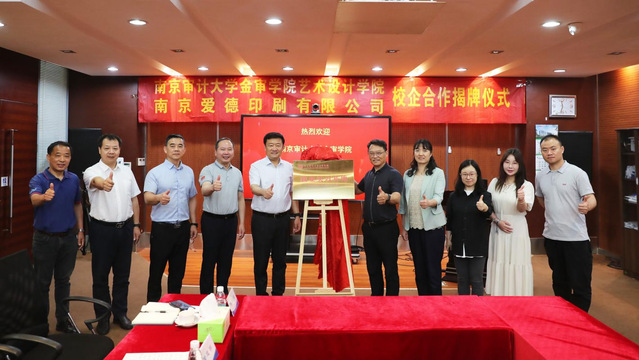 2023年6月7日,由艺术与设计学院院长王鸣义教授及王立峰副书记带队,数字媒体艺术教研室主任唐青老师及骨干教师陈天星、肖圣林老师一行前往南京爱德印刷有限公司进行产教融合校企合作签约及“就业实习基地”揭牌。南京爱德印刷有限公司总经理刘磊、副总经理刘军民及各部门负责人共计14人参加了本次企合作签约及挂牌活动,活动由爱德印刷人力资源部副部长林左拿先生主持。