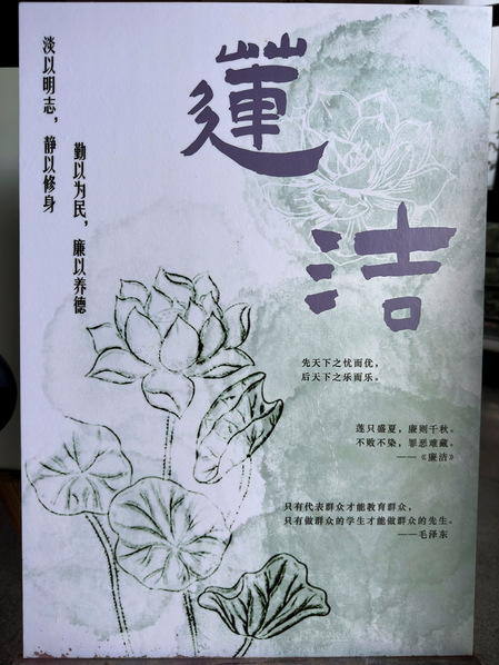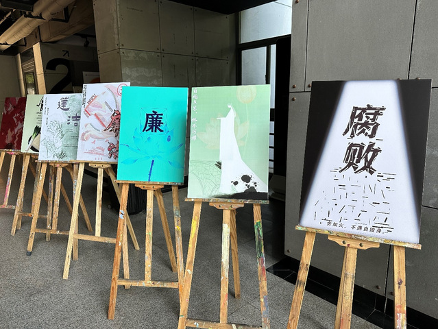 本次作品展展出了部分教师和学生设计的关于廉洁教育的海报。同学们充分挖掘校园文化、历史文献、传统经典、文物古迹等蕴含的廉洁元素,创作海报、手抄报、手绘作品,提炼廉洁文化的思想内涵、时代价值,在创作中夯实清正廉洁思想根基。