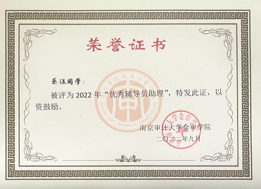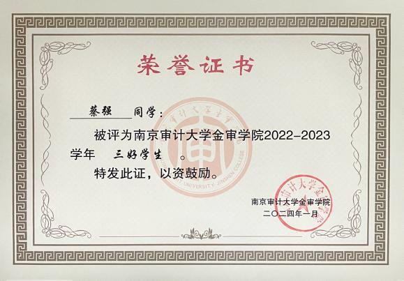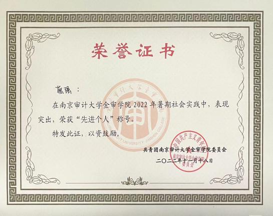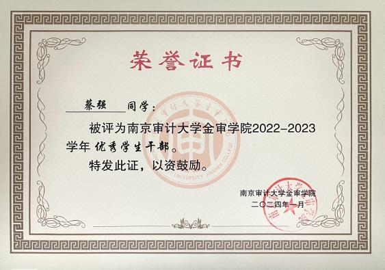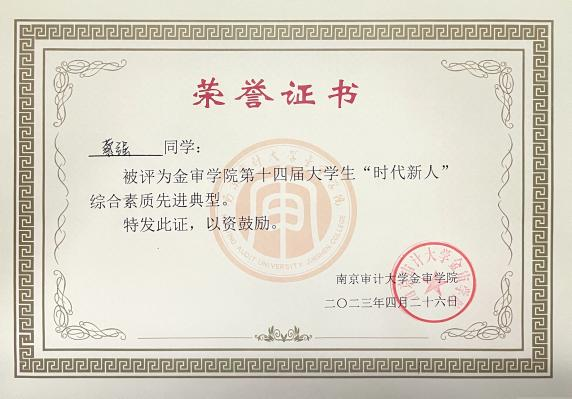 在校期间曾发表国家级期刊论文1篇、主持省级暑期社会实践1项、校级大创项目1项。获“德基”企业奖学金一等奖、校一等奖学金;获栖霞区驻区高校铸牢中华民族共同体意识宣讲活动“优秀学子”、校第二届大学生年度人物、校第十四届大学生时代新人“综合素质先进典型”、“优秀学生干部”、“三好学生”、校“优秀辅导员助理”,暑期社会实践“先进个人”等荣誉称号。