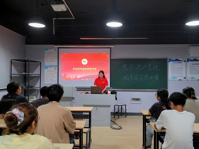 22级数媒1班王雪开展评奖评优主题宣讲,系统地介绍了学校的各项制度,包括综测的评选标准和流程。