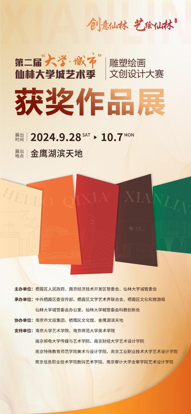 2024年9月28日下午,由栖霞区人民政府、南京经济技术开发区管委会、仙林大学城管委会主办,中共栖霞区委宣传部、栖霞区文学艺术界联合会、栖霞区文化和旅游局、仙林大学城管委会办公室、仙林大学城管委会科教创新处承办,由文客网、栖霞区文化馆、南京仙林金鹰购物中心有限公司协办的第二届“大学·城市”仙林大学城艺术季雕塑绘画·文创设计大赛获奖作品展在金鹰湖滨天地第二期中庭盛大开幕。