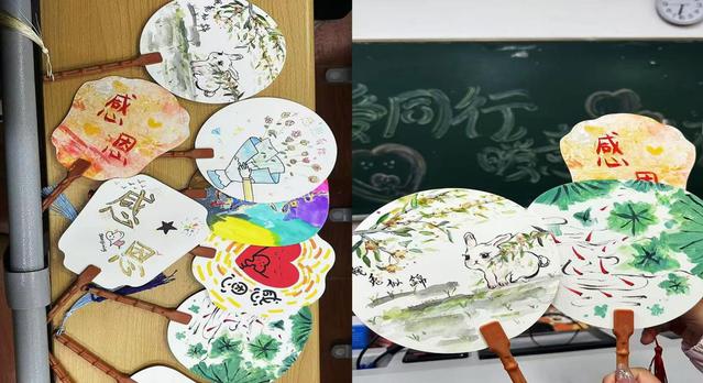 本次活动中,同学们运用自己的专业知识,落笔生花,通过绘制团扇以表感恩之意。每一把精心绘制的团扇,都饱含着同学们对于感恩的思考与理解,更加能体会到感恩的美好。
