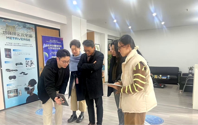 在公司创始人张帅博士的陪同下,调研团队首先参观了南京增强现实元宇宙科普教育中心,该中心展示了最新的AR技术和应用场景,包括但不限于AR-随书数字内容服务、沉浸式学习体验以及元宇宙相册编辑实战等项目。通过实际操作和演示,老师们对AR技术如何改变阅读方式、教育模式以及文化传播有了更加直观的认识。