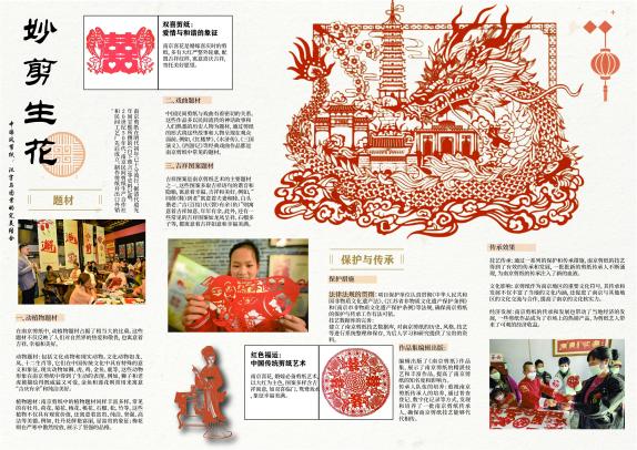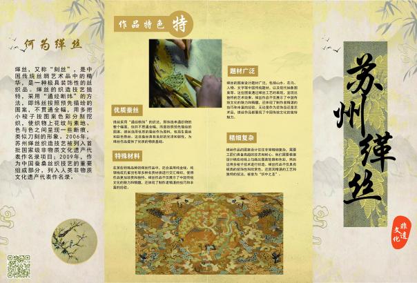 江苏拥有丰富的非物质文化遗产,涵盖传统工艺、民俗活动和地域特色美食等多个领域。本次展览的设计主题正是从江苏非遗文化中汲取灵感,将这些珍贵的文化符号融入现代设计之中。在展览作品中,我们能看到以苏州缂丝、大丰瓷刻、光福核雕、南通板鹞等非遗元素为核心的创意设计。学生们通过巧妙的构图与折页设计,将非遗文化以新的形式呈现,赋予其全新的生命力。