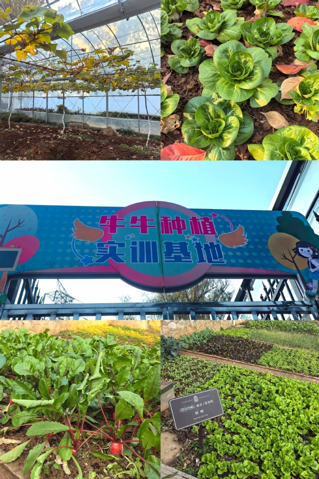 我们看到了塑料的温室培养棚,被规划得整齐干净的绿色格子,那里分别种植了品类丰富的绿色蔬菜,学生们互相调侃着竟不认得几种蔬菜,要靠猜的。陈主任说,在那大棚中,种的是阳光玫瑰葡萄,成熟了就让小朋友们来采摘,体验收获的乐趣。这确实是一种乐趣,想起儿时最新奇的事情就是去果园采摘水果。看到老师和园艺师们用心的成果,在这一小方天地中,模拟出了大自然最淳朴的形态。孩子们在学习之余还能与自然亲近,疗愈身心,想到他们生活在爱护与温暖中,此刻的心情正如眼前的景象一般,天是蓝的、树是绿的、果香馥郁,微风吹来不觉得凉,反而多了一丝爽朗。