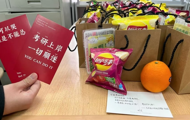 学院为每位考研学子准备了一份小礼包,内含实际用品暖宝宝和富有寓意的小食,此外,学弟学妹们也亲手制作了祝福卡片,写上了满满鼓励的话语和温馨的祝福,以此表达对学长学姐们的敬意和支持。
