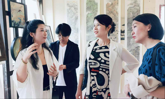 张文婷在展览现场作品前为中国文旅部曼谷中国文化中心主任赵歆导览