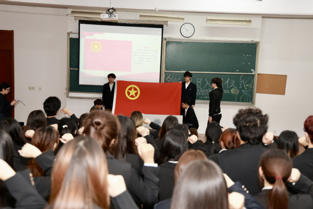 佩戴团徽环节,熠熠生辉的团徽佩戴在新团员胸前,象征着责任与使命的传承。优秀团员代表张敏行带领新团员面向团旗,高举右拳,庄严宣誓。“我志愿加入中国共产主义青年团……” 铿锵有力的誓言响彻全场,字字千钧,表达了新团员们对共青团的无限向往和为共青团事业奋斗的坚定决心。