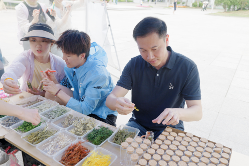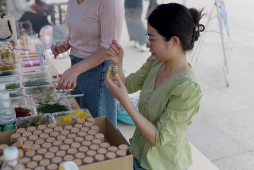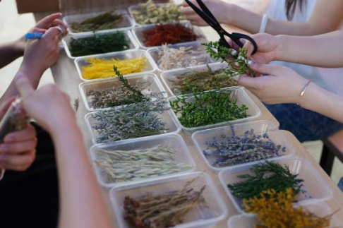 玻璃瓶与缤纷干花铺陈成诗,透明画布与彩笔静候心声。师生们或以花为笔,将薰衣草的宁静、玫瑰的热烈封存于瓶中,创作独属自己的“情绪香氛瓶”;或以画为语,在透明画布上挥洒灵感,写下对未来的期许、对当下的感悟,甚至匿名传递一句暖心寄语。现场欢声笑语与花香交融,压力在指尖释放,温暖在心间流淌。