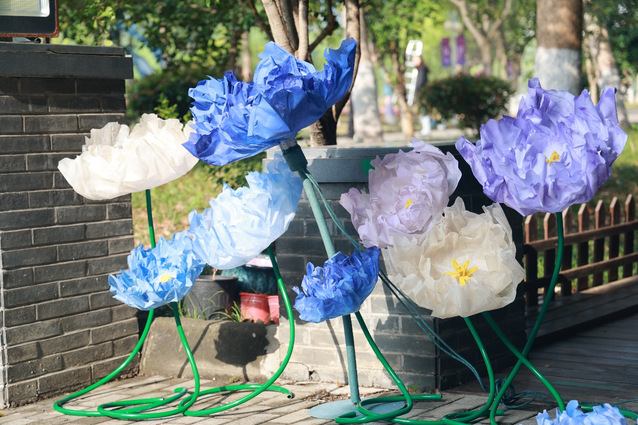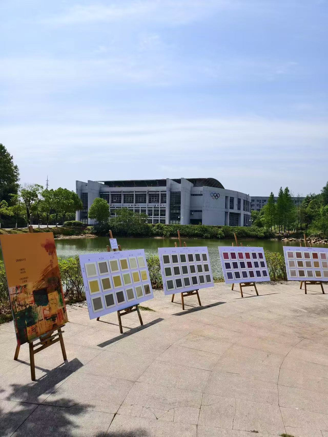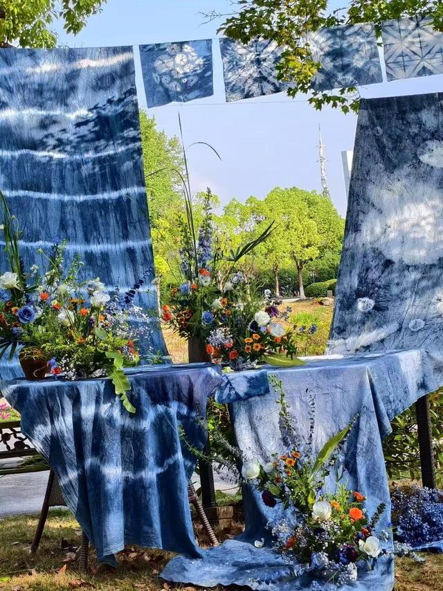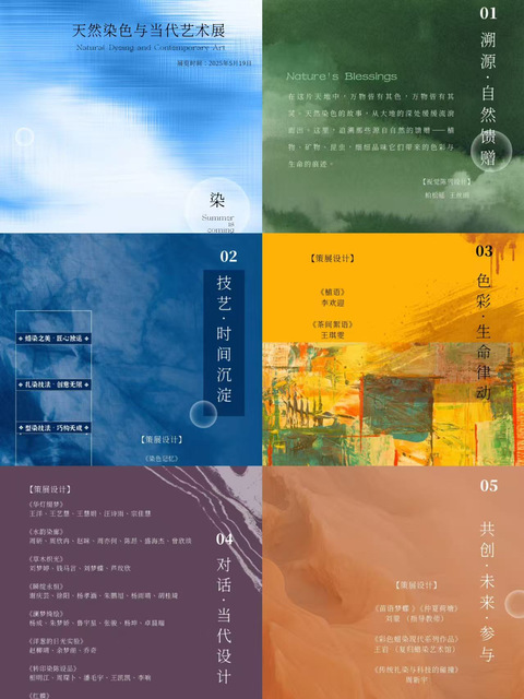 展览现场,五大主题板块层层递进:在展览现场,第一板块【溯源·自然馈赠】以苏木、虎杖等染料植物标本陈列为核心,追溯植物染料的天然本源;随后的【技艺·时间沉淀】通过历史文献、工艺流程解析、传统工具实物及60年代蜡染背扇等珍贵藏品,呈现传统技艺的文化积淀;步入【色彩·生命律动】展区,近300张渐变色装板揭示同种染料在不同面料上的色谱变幻;第四板块【对话·当代设计】则以同学们结合创意思维设计出装置艺术,重构植物染技艺,展现传统工艺与现代审美的跨界碰撞;最终在【共创·未来·参与】互动场域,观众既可亲手体验植物染制作,又能观摩当代蜡染艺术家的创新作品。五大主题从自然本源到人文创新,构筑起传统技艺的完整叙事链。
