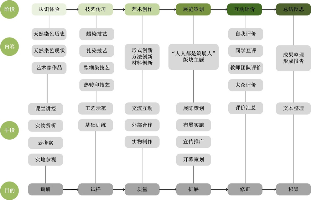 作为环境设计专业选修课,该课程打破传统教学模式,以“体验、传习、劳作、创新”为路径,构建六阶段教学闭环:认识体验、技艺传习、艺术创新、展览策划、互动评价以及总结反思构成,每个阶段对应不同的教学内容。