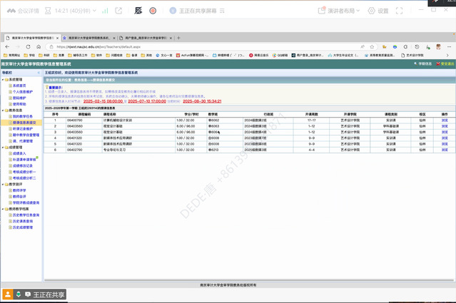 会议首先对教学管理系统进行全流程演示,重点覆盖三项操作:一是指导教师通过统一平台查课表,强调账号安全与信息保密;二是规范学生名单下载、授课信息上传,确保课程信息实时更新;三是明确成绩提交截止时间及调停课申请的审批流程,助力教学管理高效开展。