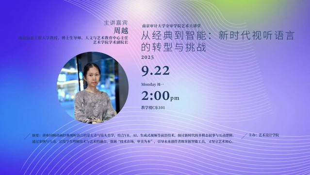 本次讲座特邀教育部动画与数字媒体艺术教育指导委员会委员、南京信息工程大学教授、博士生导师、人文与艺术教育中心主任、艺术学院学术副院长、周越担任主讲。周越教授以“从经典到智能:新时代视听语言的转型与挑战”为题,系统梳理了从经典动画的蒙太奇与镜头美学,到VR、AI、生成式视频等智能技术驱动下的多模态叙事与互动逻辑,呈现出一幅视听语言在技术演进中不断转型的生动图景。