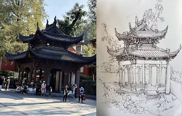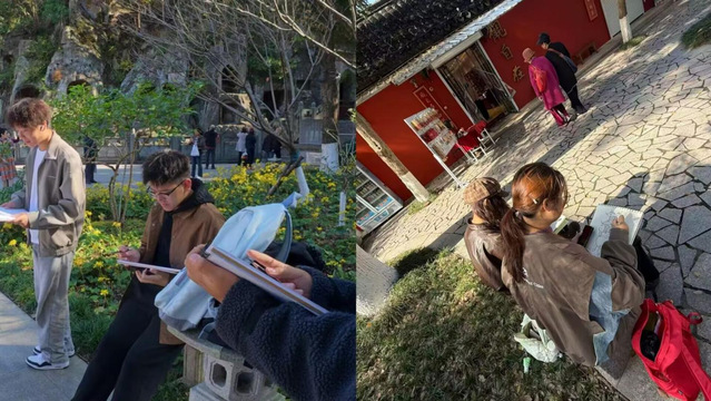采风过程中,同学们在山石草木间驻足观察景物的细腻肌理,在亭台楼阁里观赏描摹古建筑的精妙结构,在湖畔桥廊中静坐描绘倒影交织的粼粼波光。部分同学还借助手机、平板等设备采集影像素材,为后续融入数字艺术创作积累灵感。照片,永远无法取代身临其境时的震撼、那只属于秋天的灵动与大自然的无限生机。
