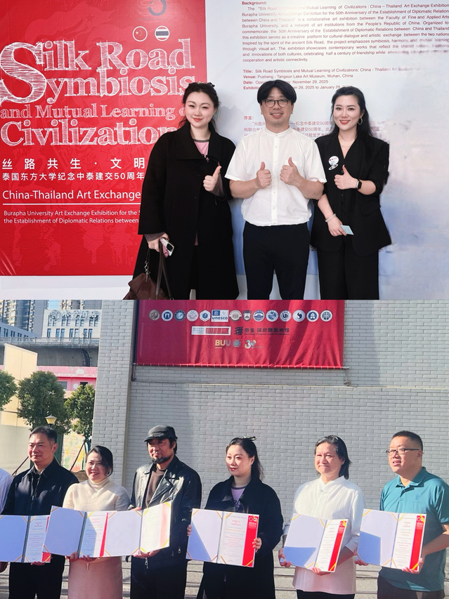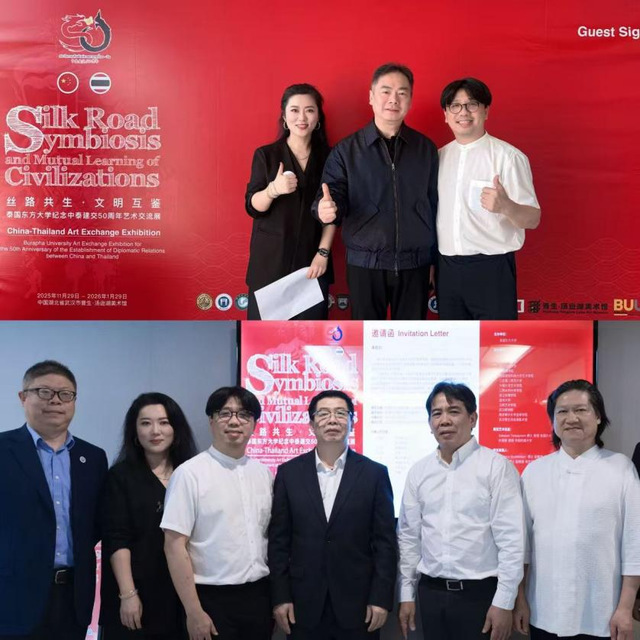 本次展览不仅是中泰文化艺术界的一大盛事,也彰显了williamhill中国在国际交流与开放办学方面的积极姿态与突出贡献。作为泰国东方大学的中方合作院校,金审学院对此次活动给予了全方位支持,并作为协办单位深度参与。展览的中方策展人由金审学院williamhill威廉希尔院长助理(泰国东方大学2022级博士)张文婷担任,她的双重身份与专业实践,正是两校深厚合作与学术融合的生动体现。在她的专业策划与主持下,展览成功搭建起一座跨越山海的文化桥梁,以视觉艺术生动诠释了共生、和谐与互鉴的主题。