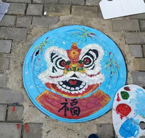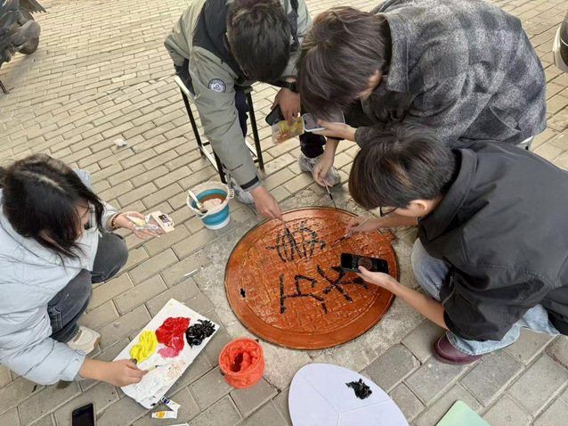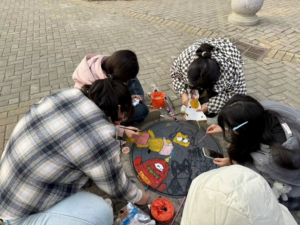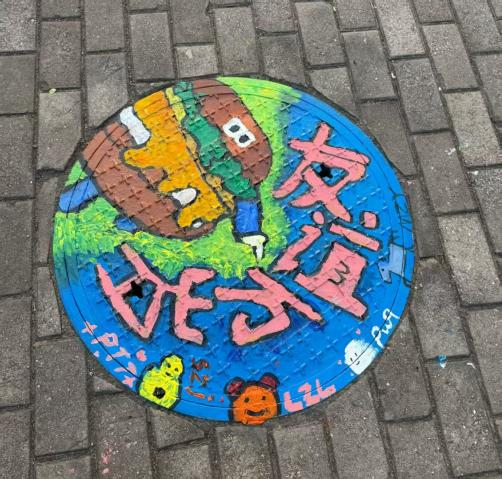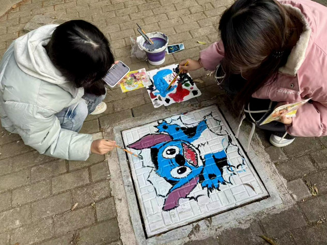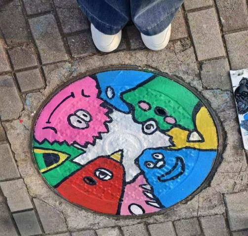 活动现场热闹非凡,同学们以小组为单位,提前备好颜料、画笔、调色盘等工具,准时抵达指定区域集合。围绕井盖展开热烈讨论,从主题构思到色彩搭配,从线条勾勒到细节填充,每一个环节都反复斟酌、精益求精。