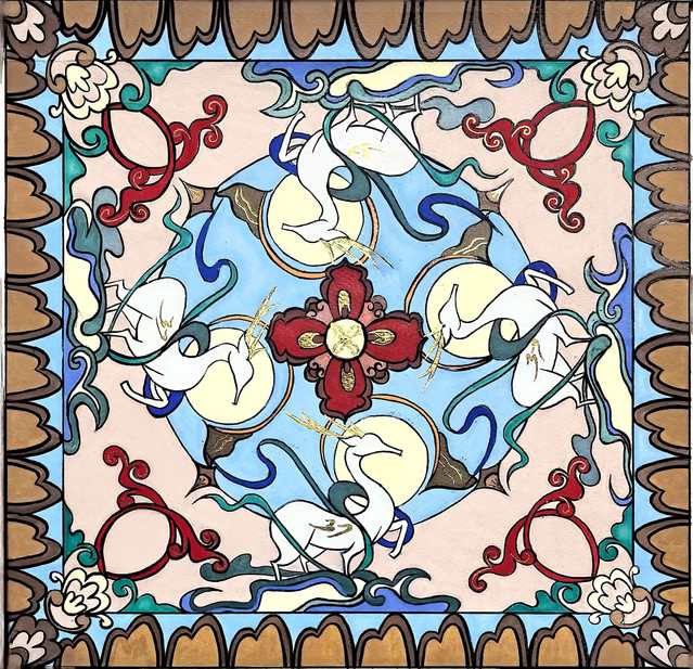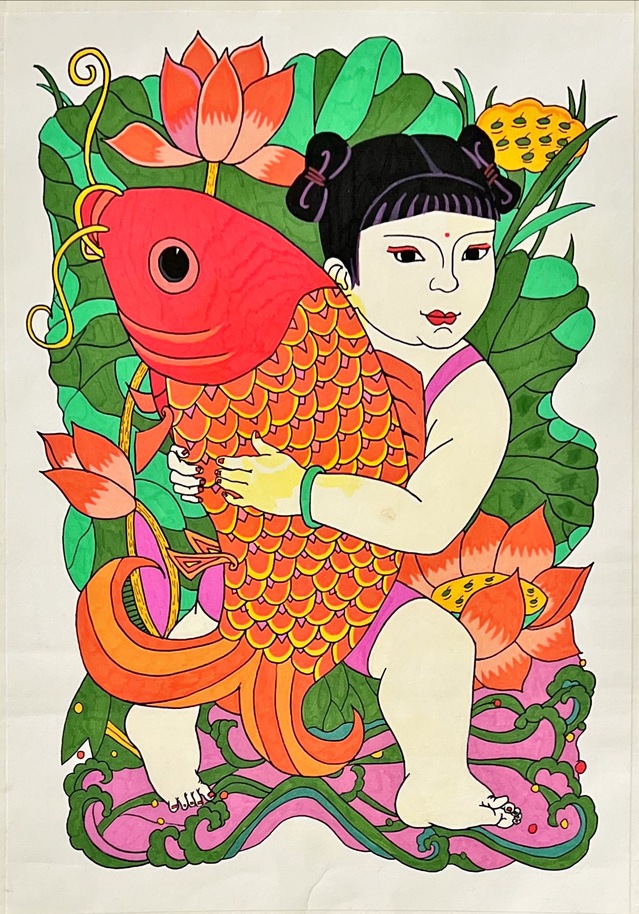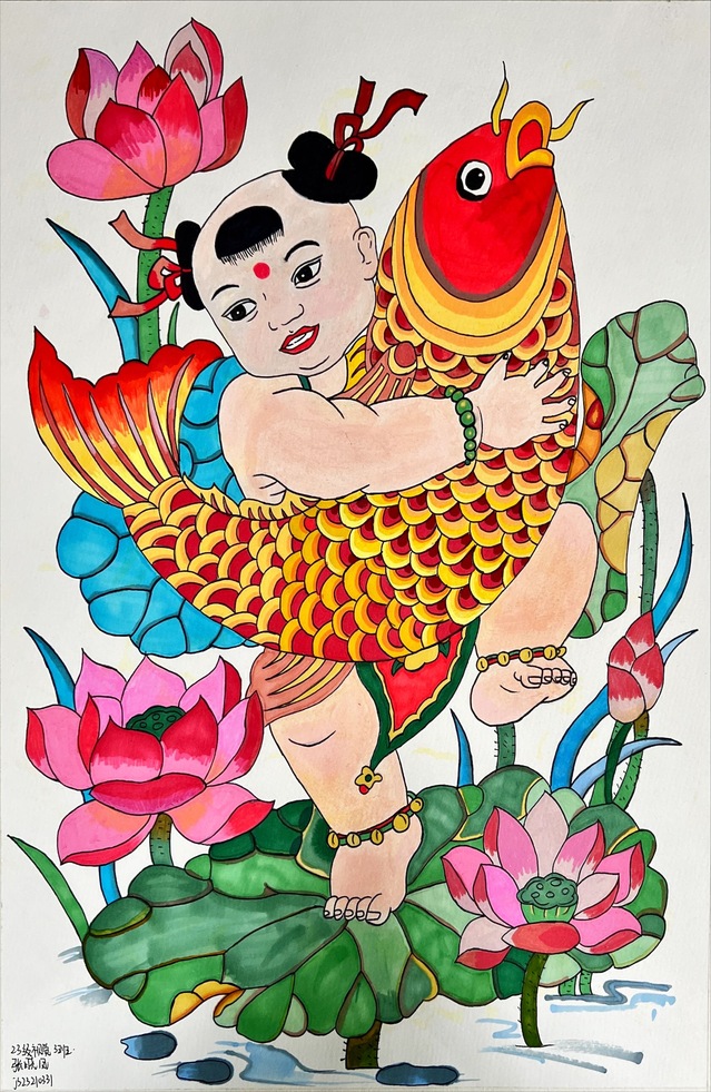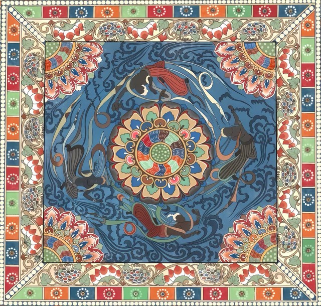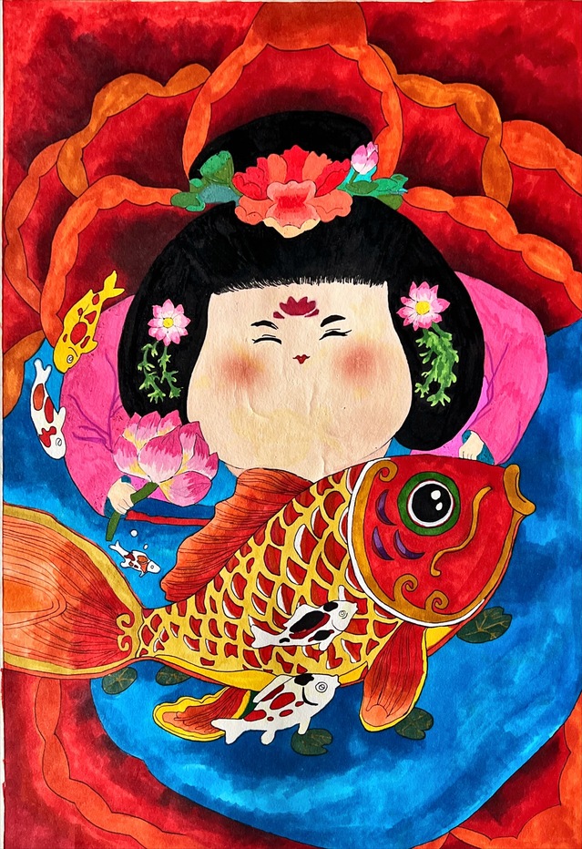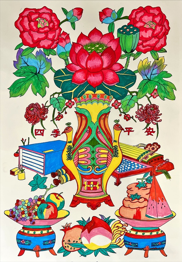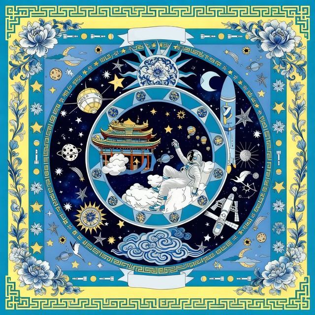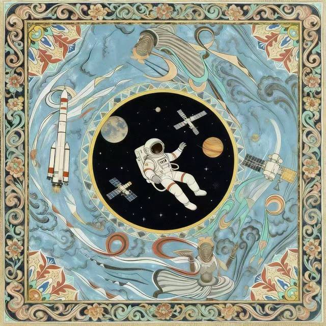 本次展览的创作主题横跨“年画新绎”“藻井幻化”“幸福刻度”与“星际之纹”四大领域。学生们不仅通过精湛的手绘功底,赋予年画以当代温度、再现敦煌藻井的繁复肌理,更巧妙地运用AIGC技术,构建出描绘日常生活的色彩图谱与充满未来感的航天视觉意象。两种创作方式在作品中形成了有机互补:手绘奠定了设计的筋骨与情感内核,而智能生成技术则作为创意辅助与思维延伸工具,极大地拓展了视觉表达的边界。