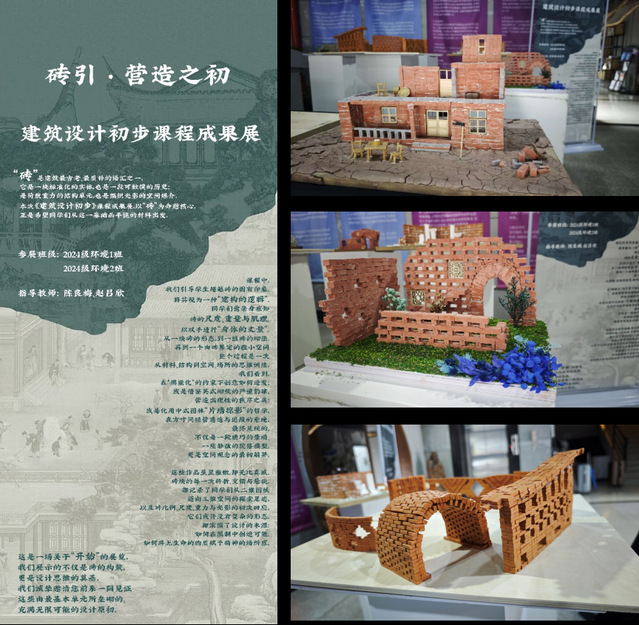本次作品展是一场关于“开始”的展览。2024级环境设计专业学生的作品所展示的不仅是砖的构筑,更是设计思维的奠基。这些作品虽显稚嫩,却无比真诚。砖块的每一次转折、交错与悬挑,都记录了同学们从二维图纸迈向三维空间的探索足迹,以及对比例、尺度、重力与光影的初次回应。它们或许没有复杂的形态,却浓缩了设计的本源:如何在限制中创造可能,如何将无生命的物质赋予精神的场所感。