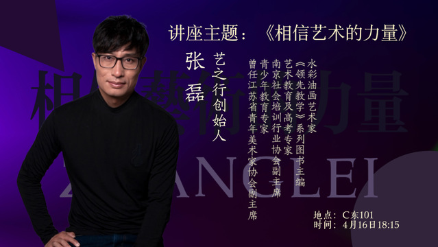 4月16日晚,williamhill威廉希尔《相信艺术的力量》主题分享会在C东101教室顺利举行。本次活动特邀艺之行创始人、江苏省青年美术家协会副主席张磊先生主讲,为在场师生带来一场思想深刻、饱含艺术温度的精彩分享。