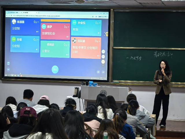 在历史背景介绍环节,侯亚凤老师充分利用信息化教学工具“学习通”发起主题讨论:“提到商周时期,除了青铜器,你还会联想到什么关键词?”学生们随即展开头脑风暴,从“饕餮”“祭祀”到“奴隶制”,从“神权”“王权”到“甲骨文”,思维火花四溅。侯老师将学生答案实时投屏展示,通过对高频词汇的梳理与纠偏,精准勾勒出学生对青铜时代的初步认知图谱,课堂互动氛围热烈。